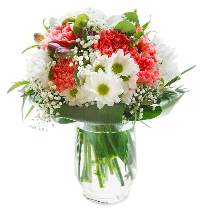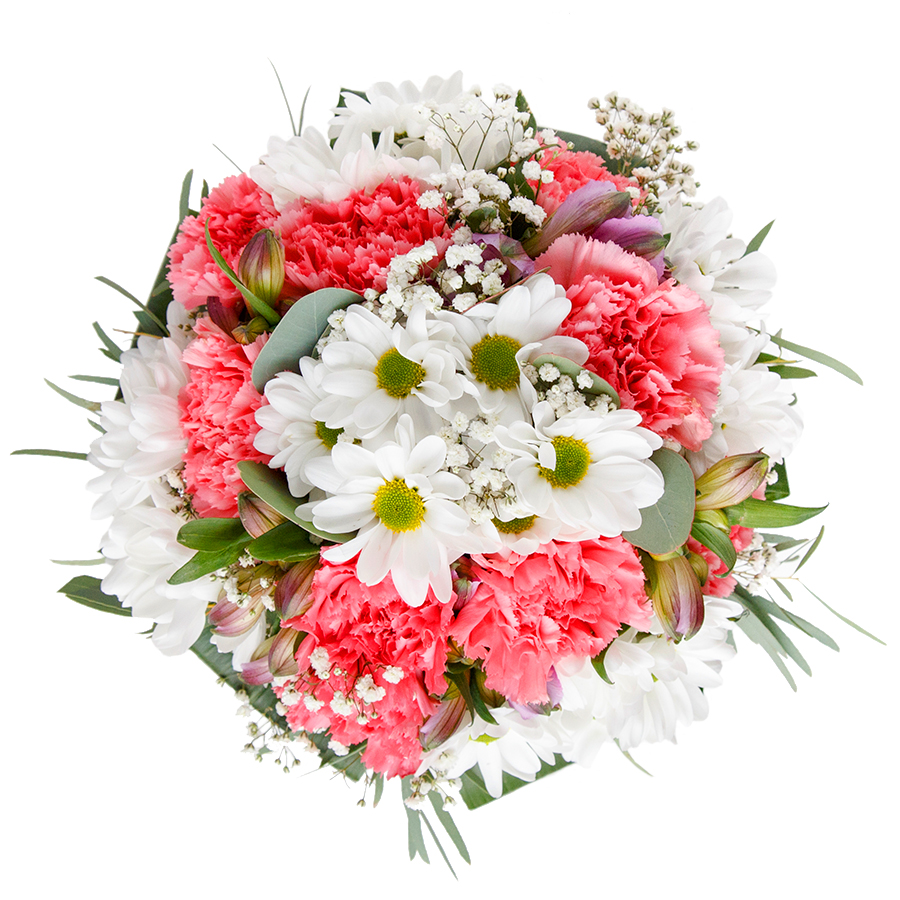 Express your affection with our captivating and unique flower arrangement. This exquisite bouquet combines a soft color scheme of white chrysanthemums, airy gypsophila, blush light pink carnations, and graceful aspidistra leaves.